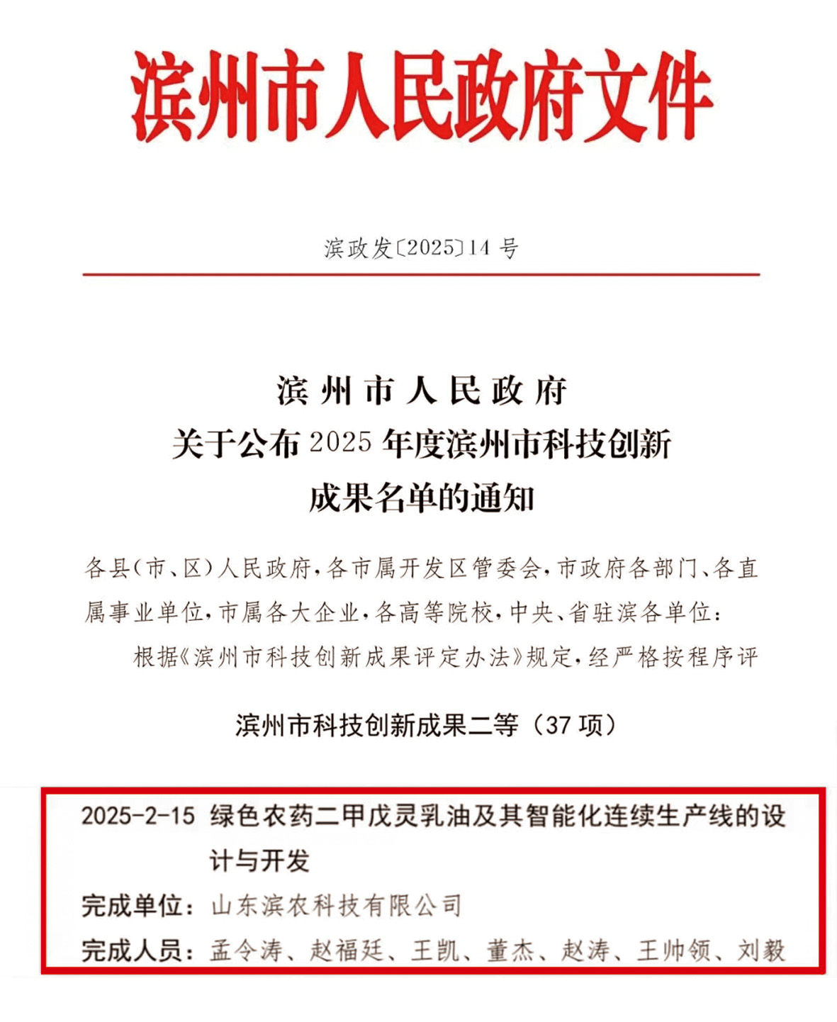 12月19日,濱州市人民政府公布了2025年度濱州市科技創(chuàng)新成果名單,我公司項(xiàng)目《綠色農(nóng)藥二甲戊靈乳油及其智能化連續(xù)生產(chǎn)線的設(shè)計(jì)與開發(fā)》榮獲二等獎(jiǎng)。該項(xiàng)目通過篩選出特殊高分子聚醚助劑為增效劑以及高效乳化劑,制得產(chǎn)品長(zhǎng)期穩(wěn)定可靠,降低了能耗與污染,并集成智能生產(chǎn)線實(shí)現(xiàn)自動(dòng)化生產(chǎn),成為綠 色農(nóng)藥與智能制造融合的典范,對(duì)于推動(dòng)我國(guó)實(shí)現(xiàn)綠色生態(tài)農(nóng)業(yè)的目標(biāo)發(fā)揮了積極推動(dòng)作用。