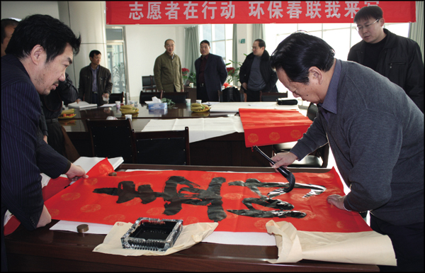 1月29日上午,由濱州市環保局、環保協會聯合舉辦,我公司冠名贊助的環保春聯有獎征集暨現場書寫在我銷售公司三樓會議室隆重開展。濱州市環保協會邀請我市書法協會主席孫樹勛先生等八位書法家,義務參加“志愿者在行動,環保春聯我來寫”活動,現場潑墨揮毫,書寫環保春聯一百多幅,墨香氤氳的和諧場面,暗合了“青山環北郭,綠水繞東城”的美好和諧意境。